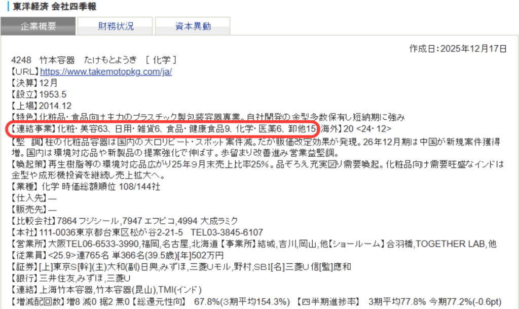 「忙しくて細かい資料を読む時間がない!」という兼業投資家の強い味方です。 紙の四季報でもオンライン版でも、【連結事業】という欄を見てください。