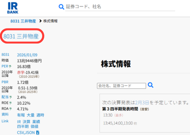 IR BANKのトップページ左上の検索窓に三井物産 もしくは、証券コード:8031を入力