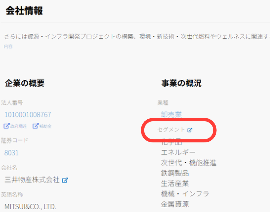 例えば、三菱商事 (8058)の公式サイトでは、「ひと目で分かる三菱商事」やこんなところに三菱商事で、複数の事業内容をすることが出来ます。