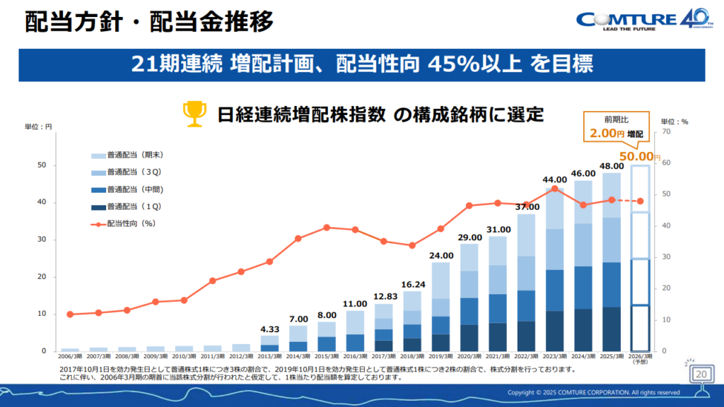 コムチュアは20年以上連続増配の実績があり、今期(2026年3月期)も増配を計画しています。