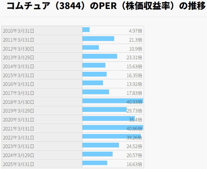 2018年頃からコムチュアの株価は高くなり、PERも20倍を超えるなど、かなり割高圏でした。