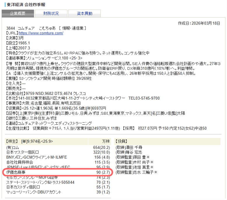 コムチュアの株主構成をチェックしていたら、上位株主に伊藤忠商事(8002)がいました。