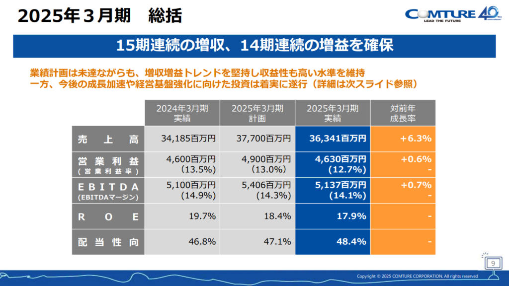 コムチュアは前述した中期経営計画で公表している通り、15期連続増収、14期連続増益達成中(2026年4月現在)。