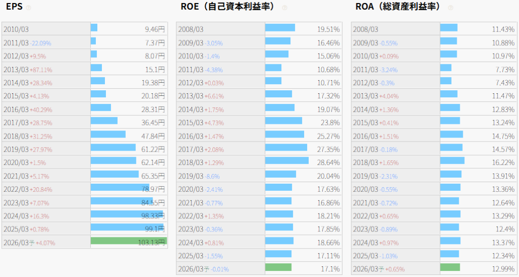 そして、経営成績100点満点と言えるレベルで、EPS推移は美しい右肩上がりの実績を誇っています。