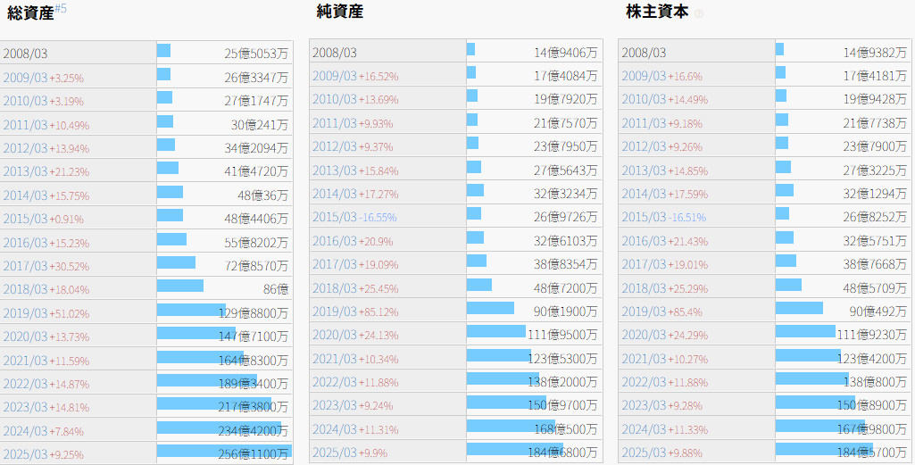 利益剰余金が毎年増えているという事は、毎年効率よく利益を出して、会社に残して貯金している=将来の設備投資や研究開発、株主への配当支払い等のために増やしているということ。