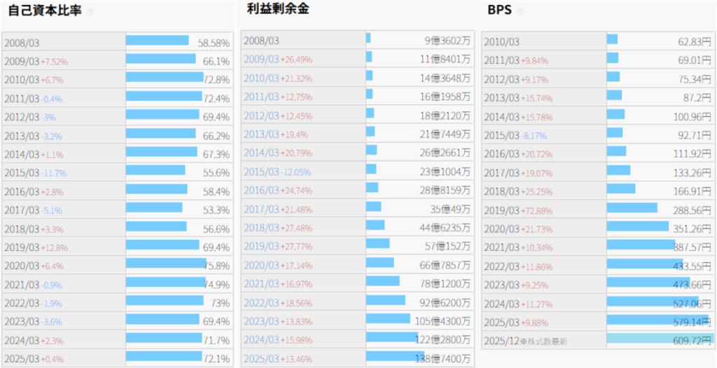 総資産、純資産、株主資本、利益剰余金、BPS(1株当たり純資産)。