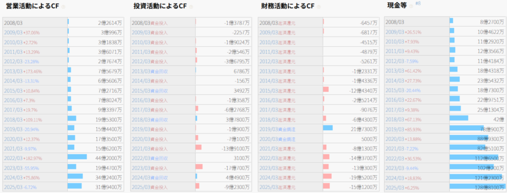 そして、財務活動によるCFが毎期マイナス傾向ということは、会社が成長するためにちゃんと投資しているということ。