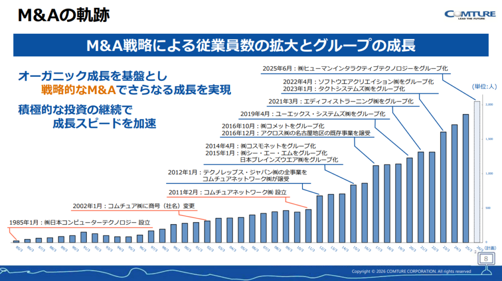 また、決算説明資料では、コムチュアの1人当たり労務費は近年約8〜9%のペースで上昇を続けていて、これはIT業界の平均を上回る高い水準。